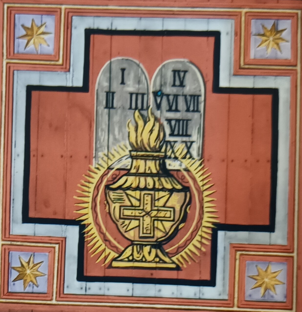Zatrzymujemy się przy kolejnej alegorii maryjnej, choć jeszcze nie odnowionej, przedstawiającej naczynie, nad którym znajdują się tablice przykazań i pojawiający się pierwotnie w tym miejscu napis: TEMPEL DES HEILIGEN GEISTES co tłumaczy się „Świątynia Ducha Świętego”. To kolejne wezwanie, w którym nazywamy, czcimy Maryję jako „Przybytek” – tak w Litanii Loretańskiej modlimy się: „Przybytku Ducha Świętego”. Maryja jest Tą, w której Duch Święty na stałe zamieszkał. Porównuje się tu Maryję z Przybytkiem, w którym zamieszkała chwała Pańska, symbolizowana przez tablice przykazań, podczas wędrówki Izraela przez pustynię. Jest też ten obraz nawiązaniem do alegorii o Arce przymierza, która zawierała kamienne tablice i do Arki Noego, nad którą ukazana jest gołębica, symbol Ducha Świętego.