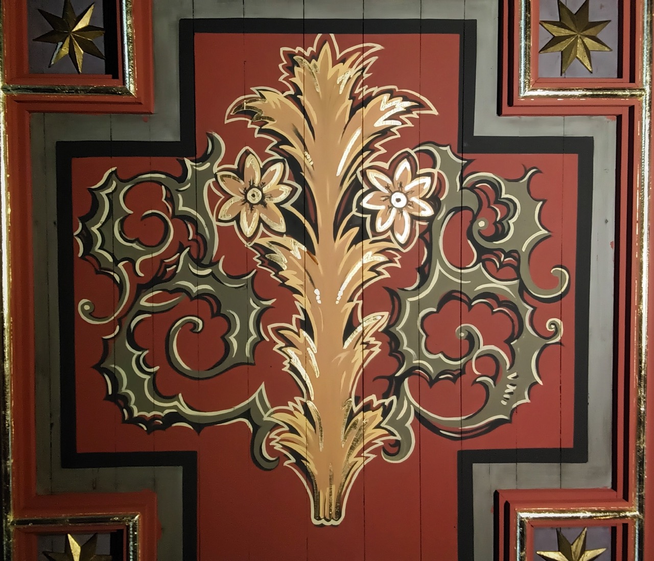 Z kolejnym kasetonem naszego świątynnego sufitu przez dłuższy czas były wątpliwości co właściwie przedstawia. Dopiero powrót do przedwojennego zdjęcia i odczytanie pierwotnego napisu w języku niemieckim STAB AARON uzmysłowiło, że jest to różdżka-laska. Nawiązuje ona do słów hymnu z Godzinek: „Tyś różdżka Aronowa, śliczny kwiat rodząca”. Tytuł ten odwołuje się do ważnego wydarzenia opisanego w Księdze Liczb, gdy w czasie wędrówki ludu wybranego przez pustynię doszło do buntu przeciw Mojżeszowi i Aaronowi. Wtedy chcąc potwierdzić wybór Aarona na urząd arcykapłański, Mojżesz na słowa Boga położył przed Arką w „Namiocie spotkania” dwanaście lasek dwunastu książąt, przedstawicieli dwunastu pokoleń izraelskich podpisane ich imionami. gdy następnego ranka Mojżesz wszedł do przybytku, zobaczył, że zakwitła laska Aarona z pokolenia Lewiego: wypuściła pączki, zakwitła i wydała dojrzałe migdały. Wyniósł Mojżesz wszystkie laski do synów Izraela i każdy odebrał swoją. A Pan rzekł do Mojżesza: Połóż laskę Aarona z powrotem przed Arką Świadectwa, by się przechowała jako znak.